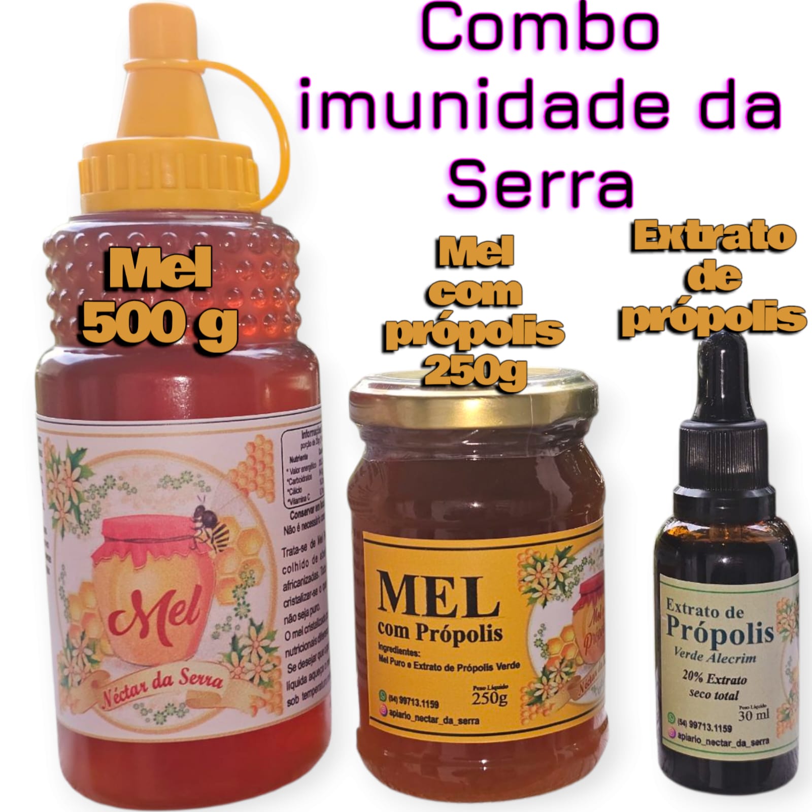 Fortaleça sua saúde com o melhor da natureza! O Combo Imunidade da Serra reúne o mel puro da nossa produção com o poder do própolis e do mel com plantas medicinais. Ideal para prevenção de gripes, tosses e fortalecer o sistema imunológico.